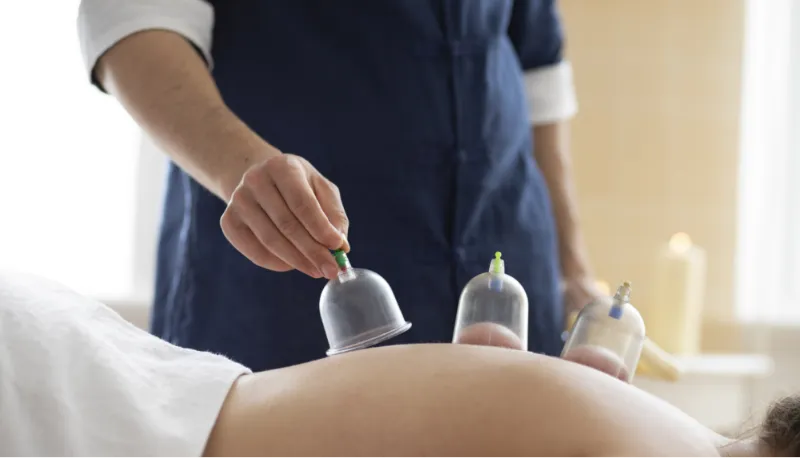 Suction cups create a vacuum on the skin to boost circulation, reduce inflammation, and ease muscle tension. Leaves temporary marks but promotes recovery and relaxation.